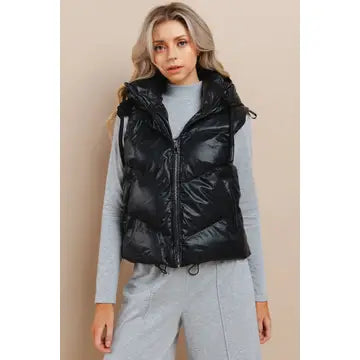 This Faux leather puffer vest with font zip-up, pockets and hood is a vibe! It is perfect for that extra layer of warmth.